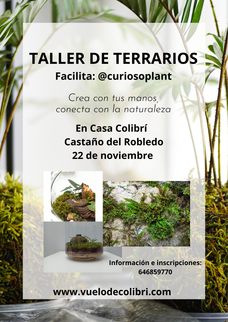 Un terrario es un pequeño ecosistema contenido dentro de un recipiente, un universo natural que se autorregula y respira vida. En este taller aprenderás a montar el tuyo, conocer sus secretos y te llevarás tu propio terrario. Un día para crear con tus manos, conectar con la tierra y disfrutar de la calma en Casa Colibrí.
