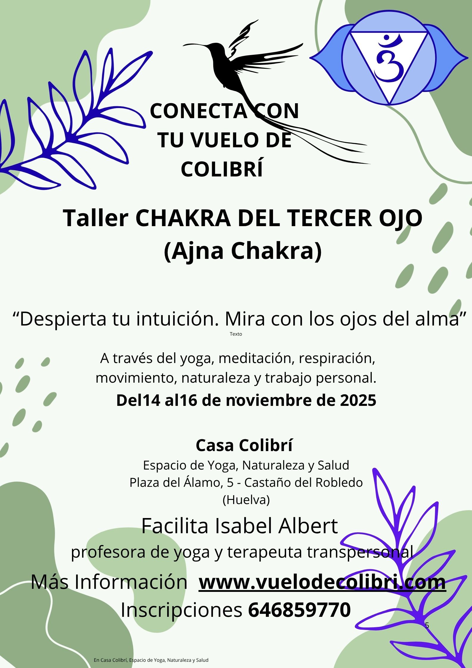 “Despierta tu intuición. Mira con los ojos del alma” Este taller pertenece al ciclo “Conecta con tu Vuelo de Colibrí” y está dedicado a Ajna Chakra, el centro de la visión interior, la sabiduría y la intuición. Cuando este chakra está equilibrado, percibimos con claridad, intuimos con confianza y mantenemos una mente serena y enfocada. Trabajaremos en despertar la intuición y la claridad mental, calmando la mente para conectar con la sabiduría interior. En Casa Colibrí, un espacio íntimo y cuidado en plena sierra de Huelva, el lugar ideal para abrirte a una vivencia transformadora.